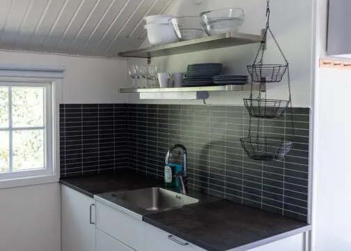 • Köksdel med spis, diskbänk, kaffebryggare, kylskåp och mikrovågsugn