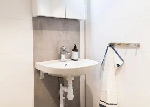 Washing machines are available in selected service buildings and washing is free of charge if you live in the complex. Detergent is included and is dispensed automatically. You book your time via a QR code on site.