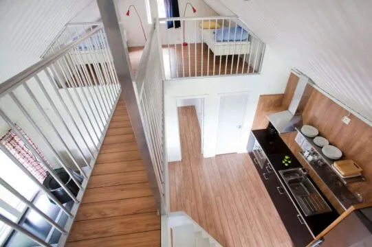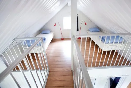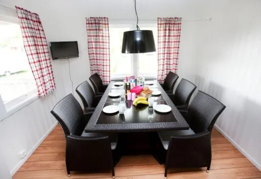 Modern cottage with two floors in open plan. Downstairs you will find a double bedroom and upstairs there are two sleeping lofts with two single beds in each loft. Kitchen / Living room with table and 6 chairs, TV. Kitchen area with stove, sink, dishwasher, coffee maker, refrigerator, freezer and microwave. Shower and WC. Veranda with garden furniture.